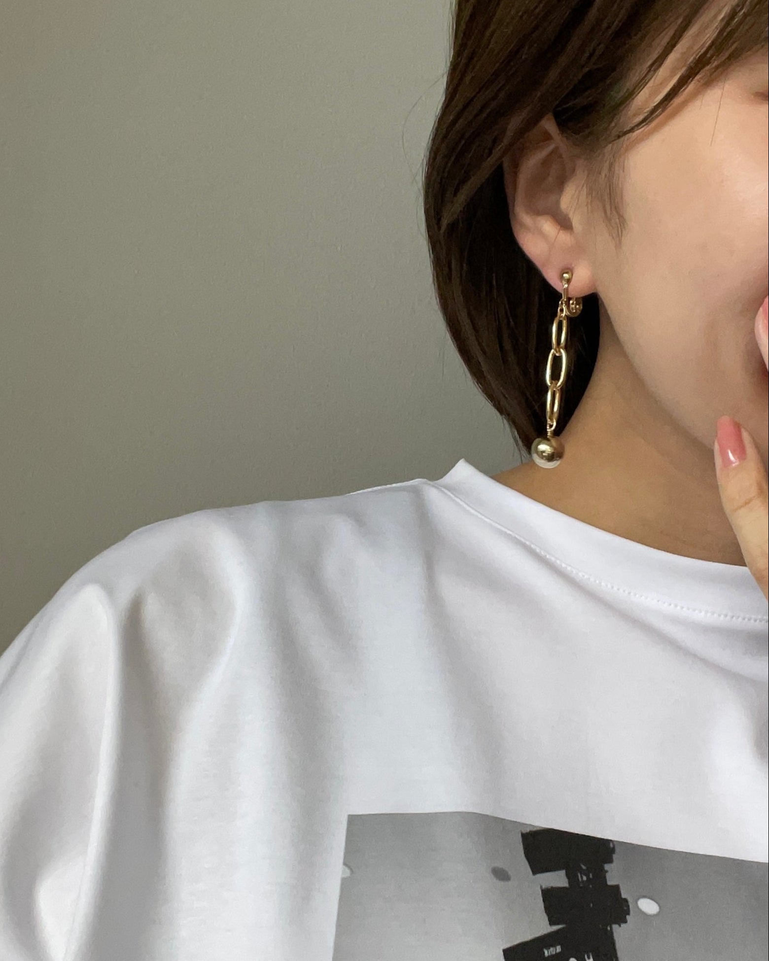 存在感のあるチェーンデザインに、ころんとしたボールモチーフを組み合わせたピアス。