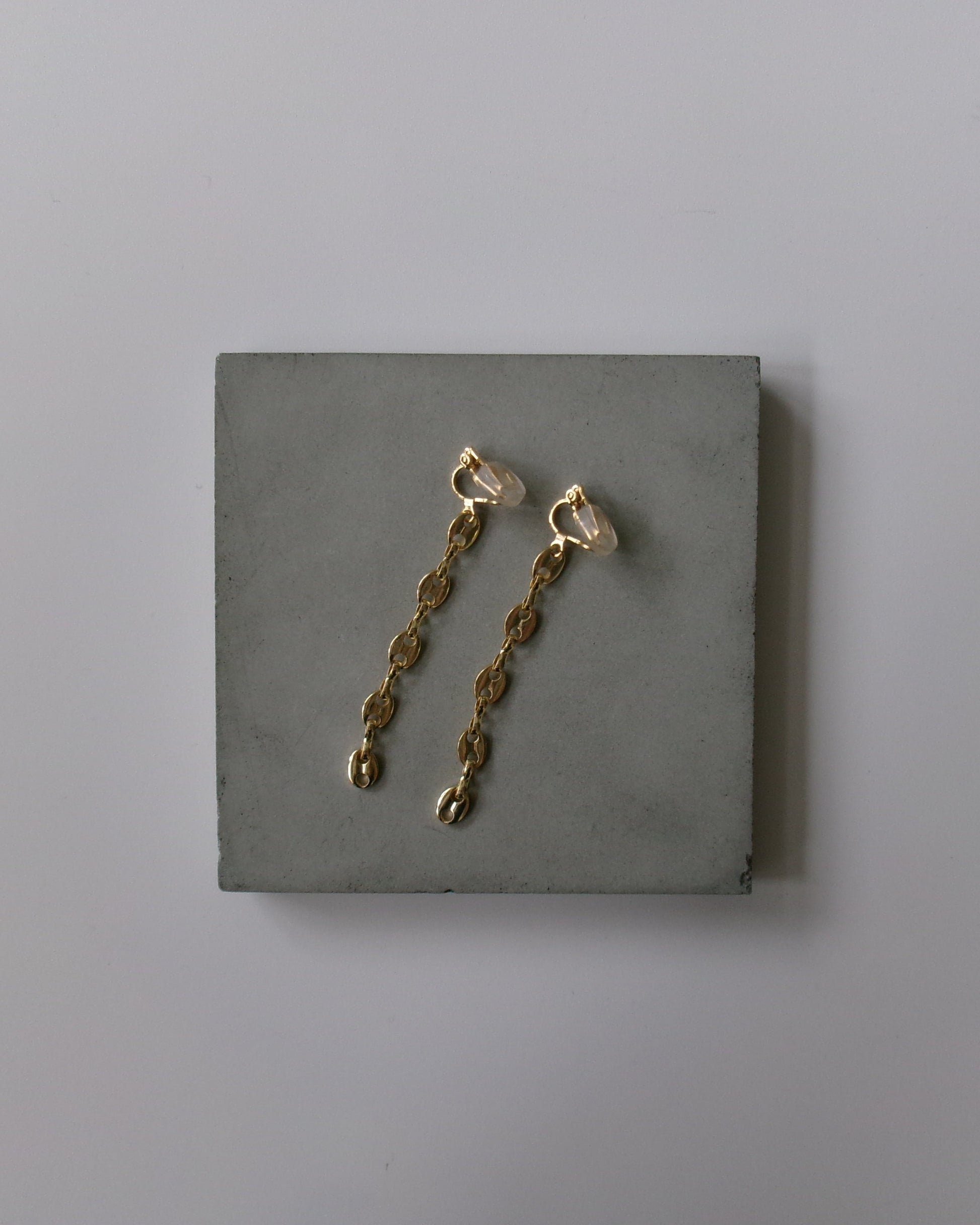 華奢なチェーンに程よいボリュームのパーツを組み合わせた、ロングイヤリング。